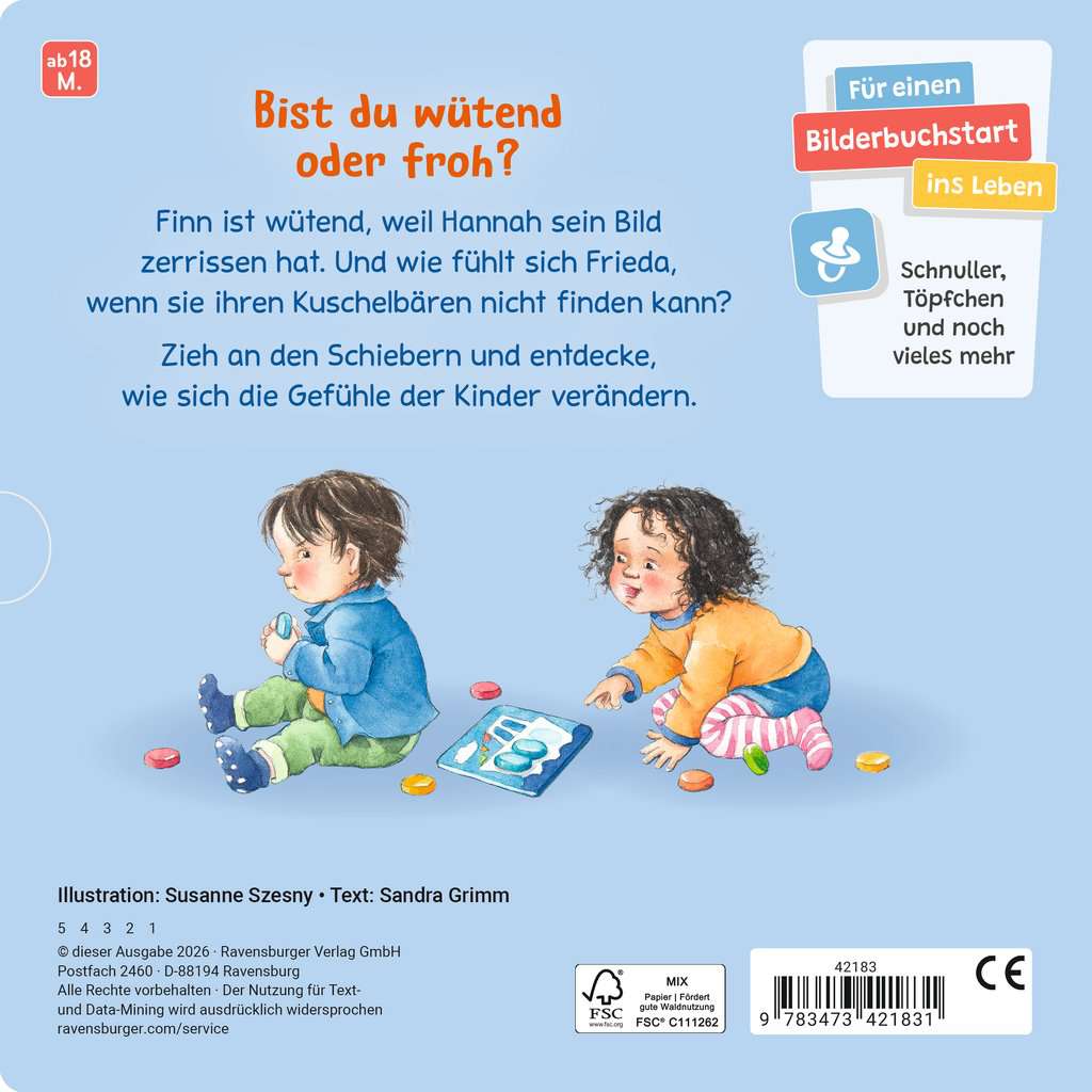 It is important to know and name your own feelings. And with small children, feelings change very quickly. First angry, then happy again; just now sad, now happy again. Thanks to the sturdy sliders on each double page, kids can change the feelings themselves in this book. This playfully invites kids and parents to get to know different feelings, name them, and talk about them.