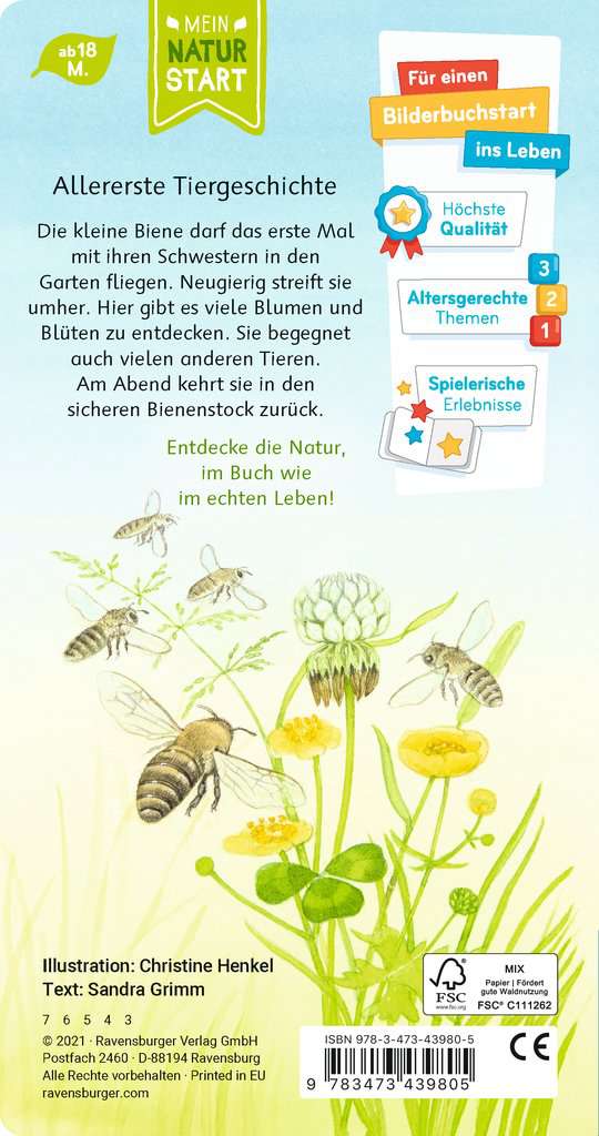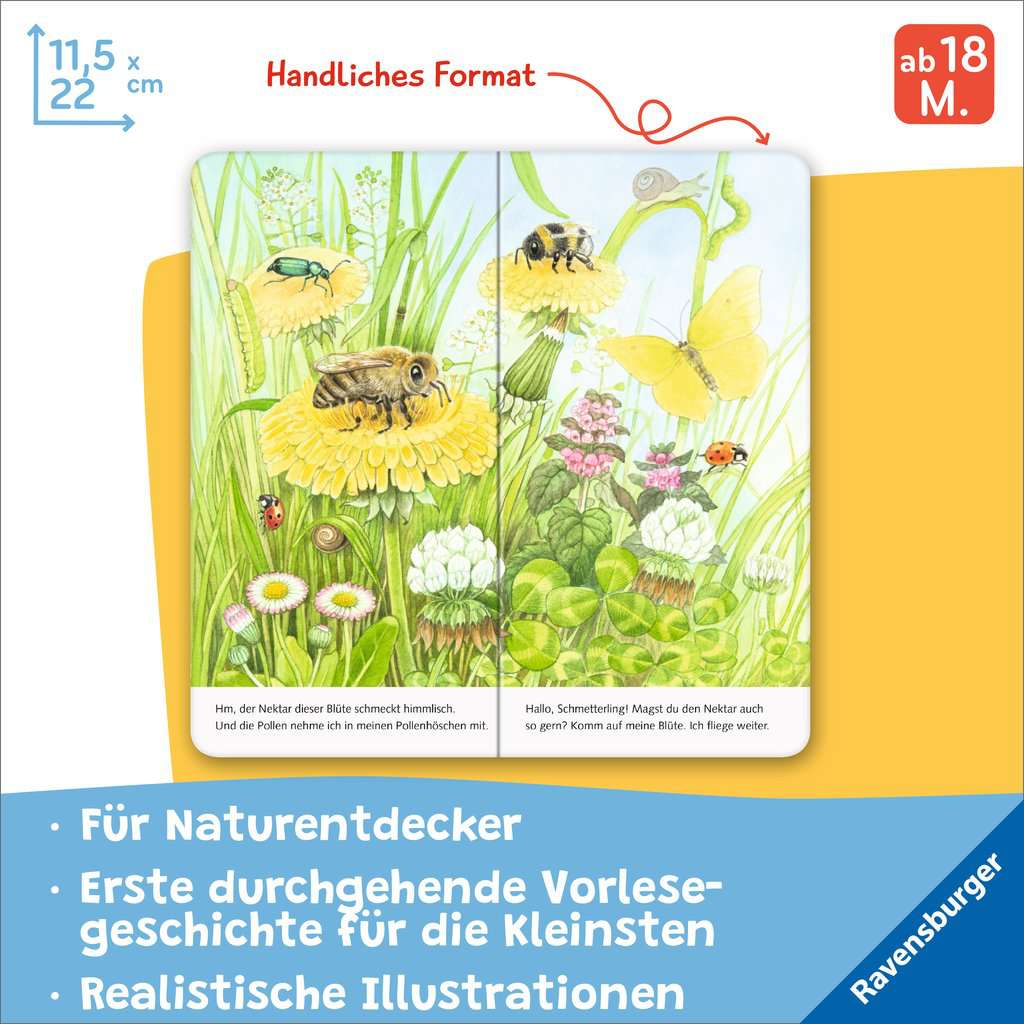 Today is a special day for the little bee: it flies out into the garden to collect pollen and nectar for the first time. Full of curiosity, it roams the garden, discovering blossoms and encountering many other insects such as butterflies and bumblebees. But it had better keep its distance from the wasps! A charming read-aloud story with simple text for little nature explorers