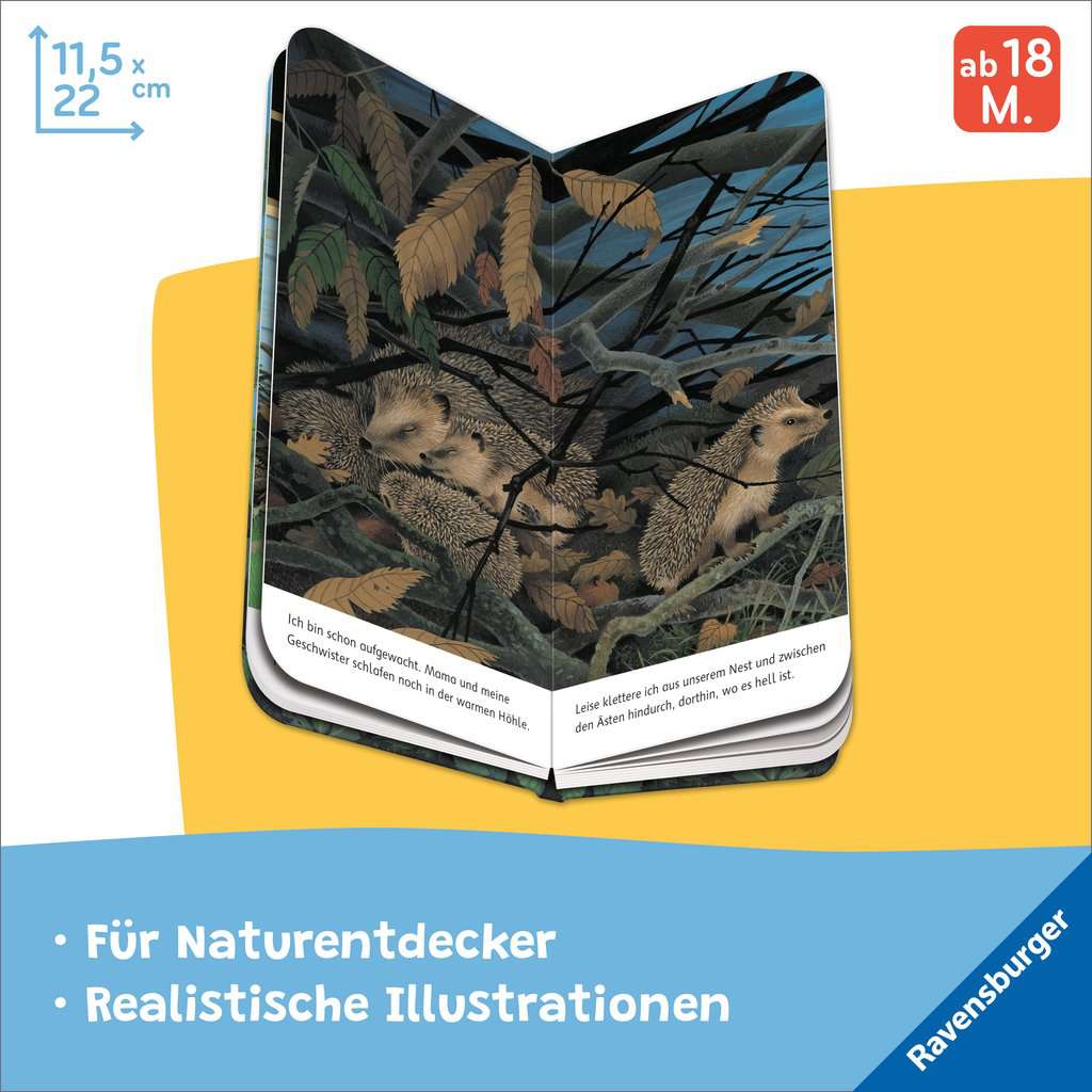 The little hedgehog and its siblings live underneath a woodpile in the garden. Its curiosity leads the little hedgehog on an adventure-filled solo journey of discovery. Toward the evening, Mum comes out into the garden as well and takes the little runaway back home. Together with its siblings, they look for food. After an exciting evening, the little hedgehog cuddles up with its mum in the nest. A charming read-aloud story with catchy text for little nature explorers.