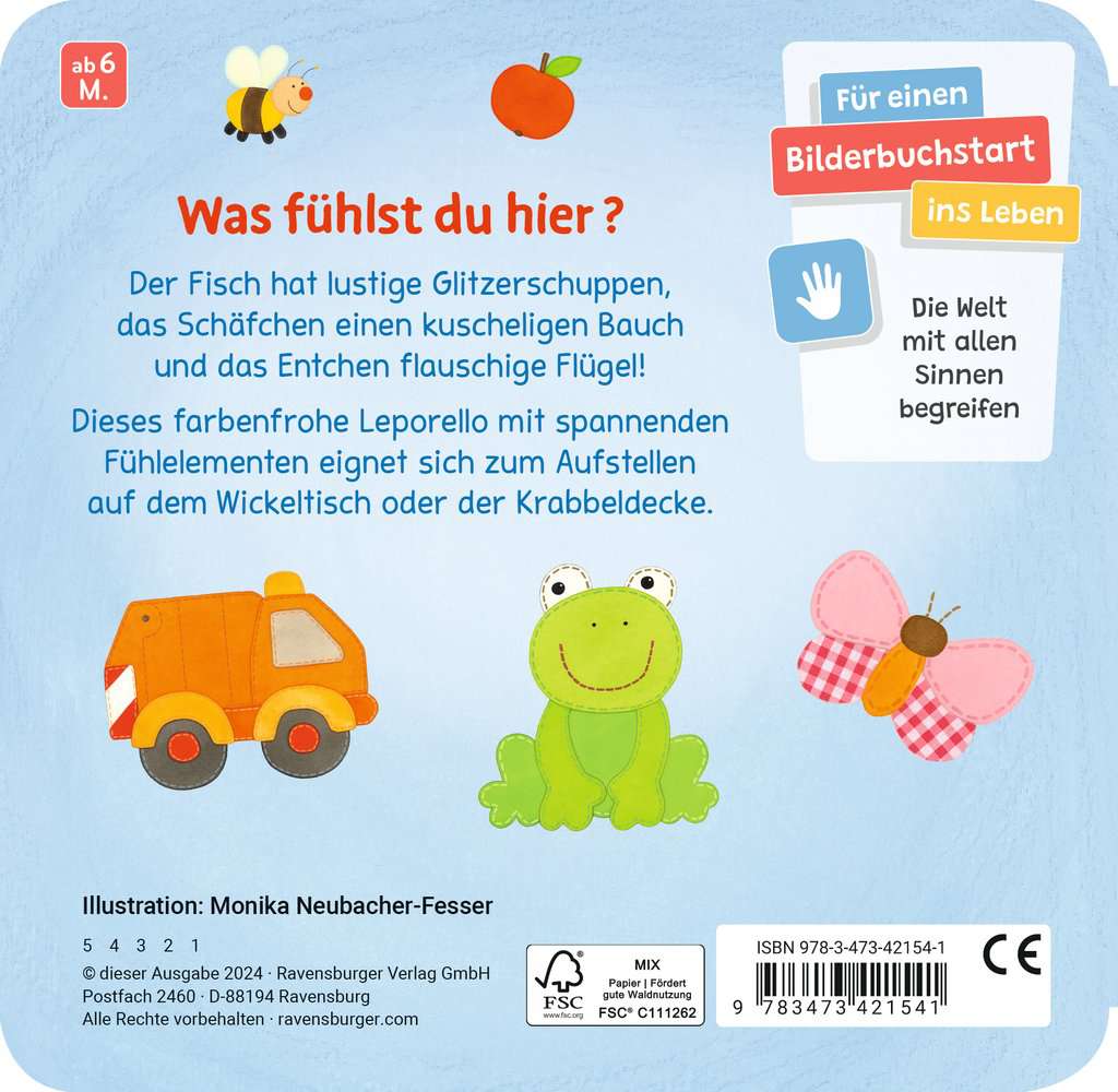 This accordion book with cheerful pictures and large tactile elements is perfect for babies 6 months and over. The book can be fully extended and the panoramic pages placed directly in front of the little explorers who can investigate the animals with all their senses: the little sheep has a cuddly belly, the fish has fascinating glittery scales and the duck has a cuddly wing! Petting the animals is fun even for very young children while casually promoting their fine motor skills!