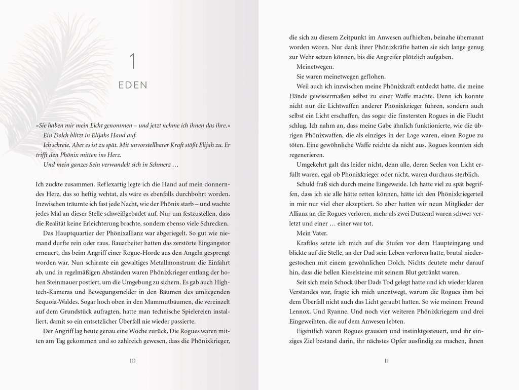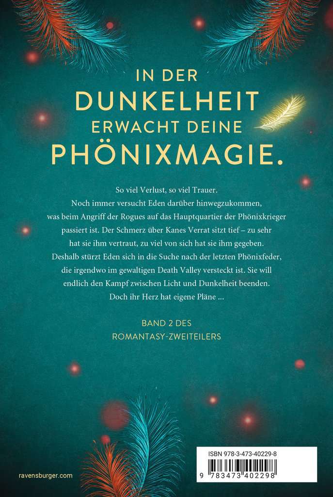 So much loss, so much grief: Eden is still trying to get over what happened when the Rogues attacked the Phoenix Warriors' headquarters. The pain of Kane's betrayal runs deep – she has trusted him too much, given him too much of herself. Eden throws herself into the search for the last phoenix feather, hidden somewhere in the vastness of Death Valley. She wants to end the battle between light and dark once and for all. But her heart has plans of its own.