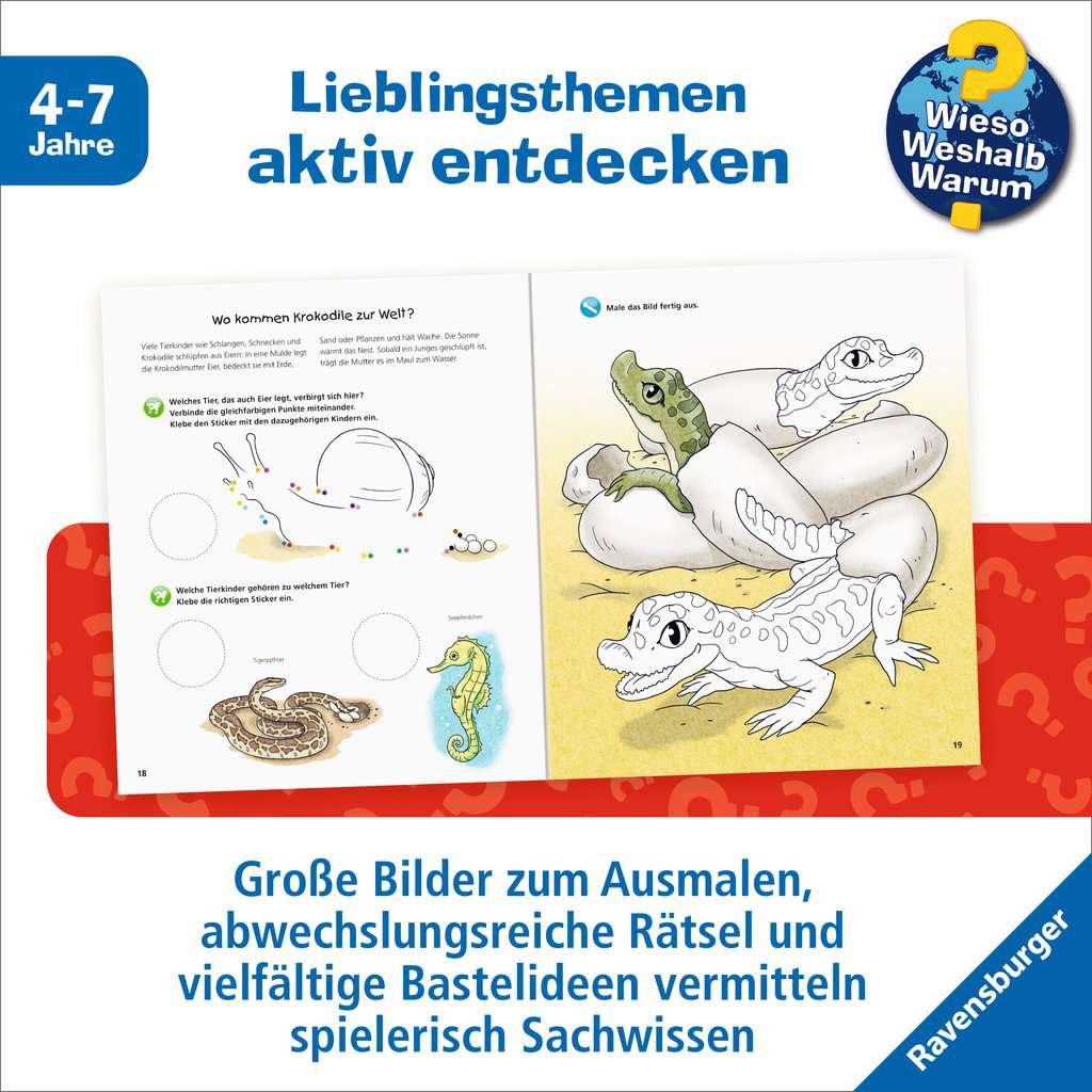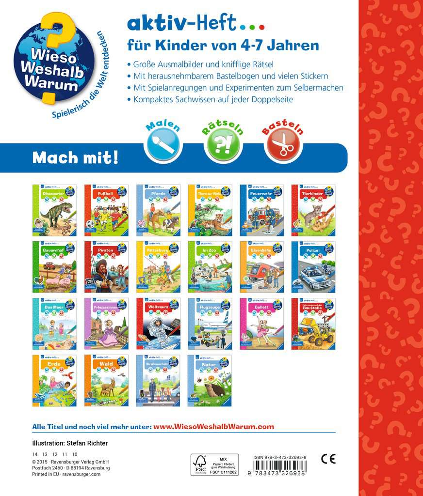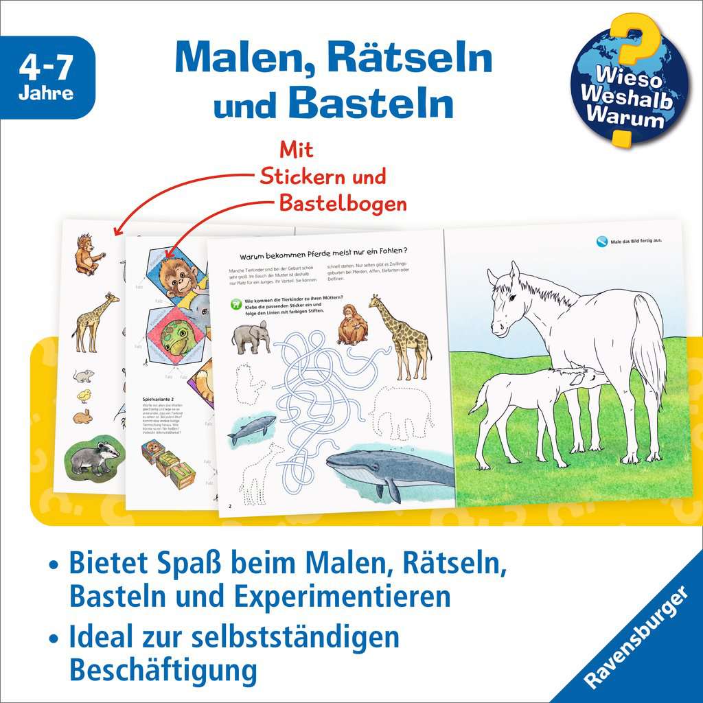 With the Activity Books from WWW, children can explore their favorite subjects on their own. Large, simple pictures encourage coloring. Short texts written especially for children convey factual information that is deepened in a fun way through puzzles. Experiments and ideas for games provide plenty of variety. And to top it all off, ideas for crafts and stickers invite children to unleash their creativity.