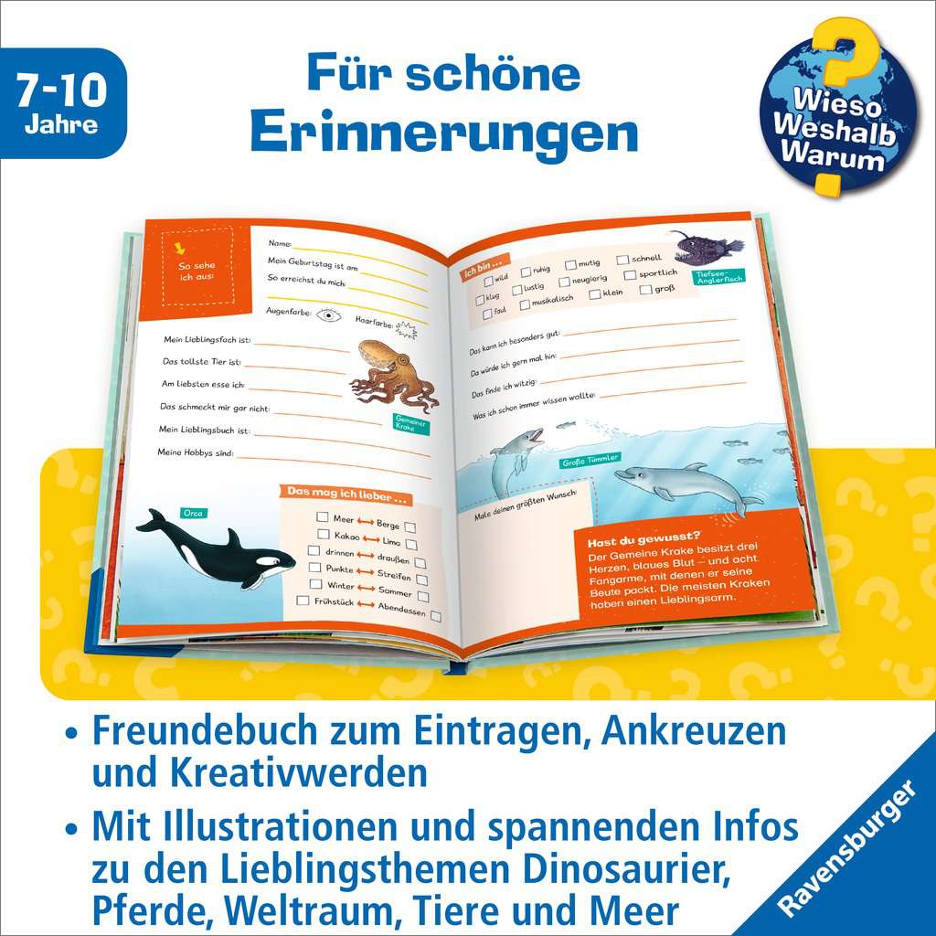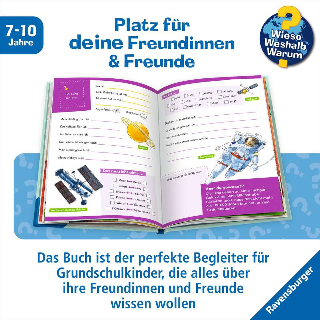 Name, birthday, eye color – along with favourite animal, biggest wish and favourite food: in this book, each child can write down, tick a box or draw what their favourites are and what they love doing. In addition, each double page offers fascinating information on one of five popular topics: space, dinosaurs, horses, animals and ocean. This book is the perfect companion for curious primary school children who want to know everything about their friends.