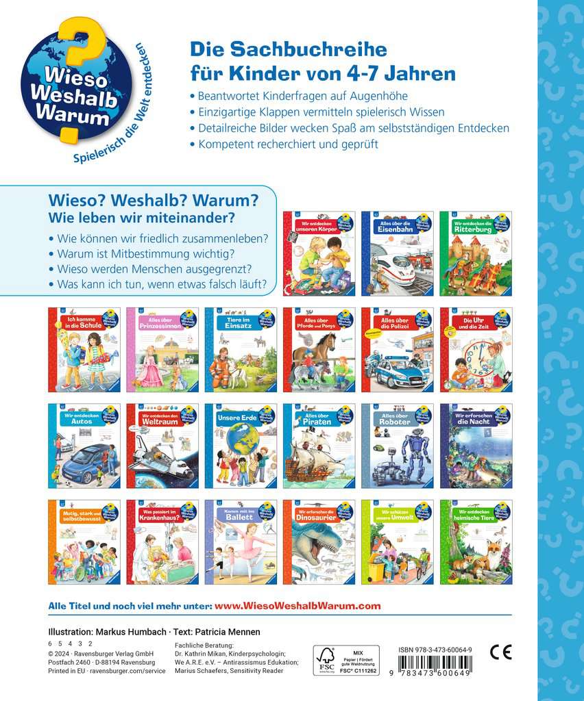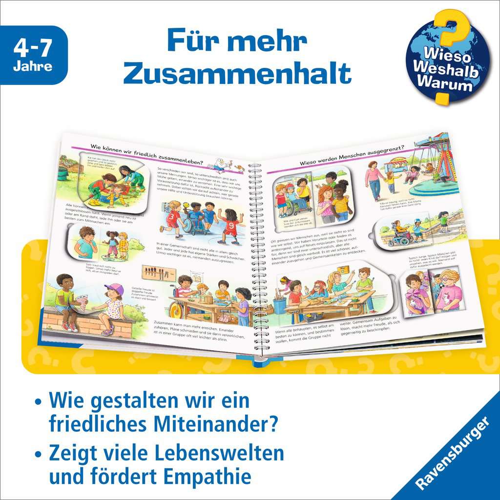 Detailed illustrations depict the foundations of coexistence. Flaps resolve situations and encourage empathy: if someone falls, we help them up. If someone is mocked, we stand by them. If stairs are the only way up, there needs to be a ramp for wheelchair users. With the help of age-appropriate images and texts, the book highlights problems, offers solutions and promotes mutual understanding.