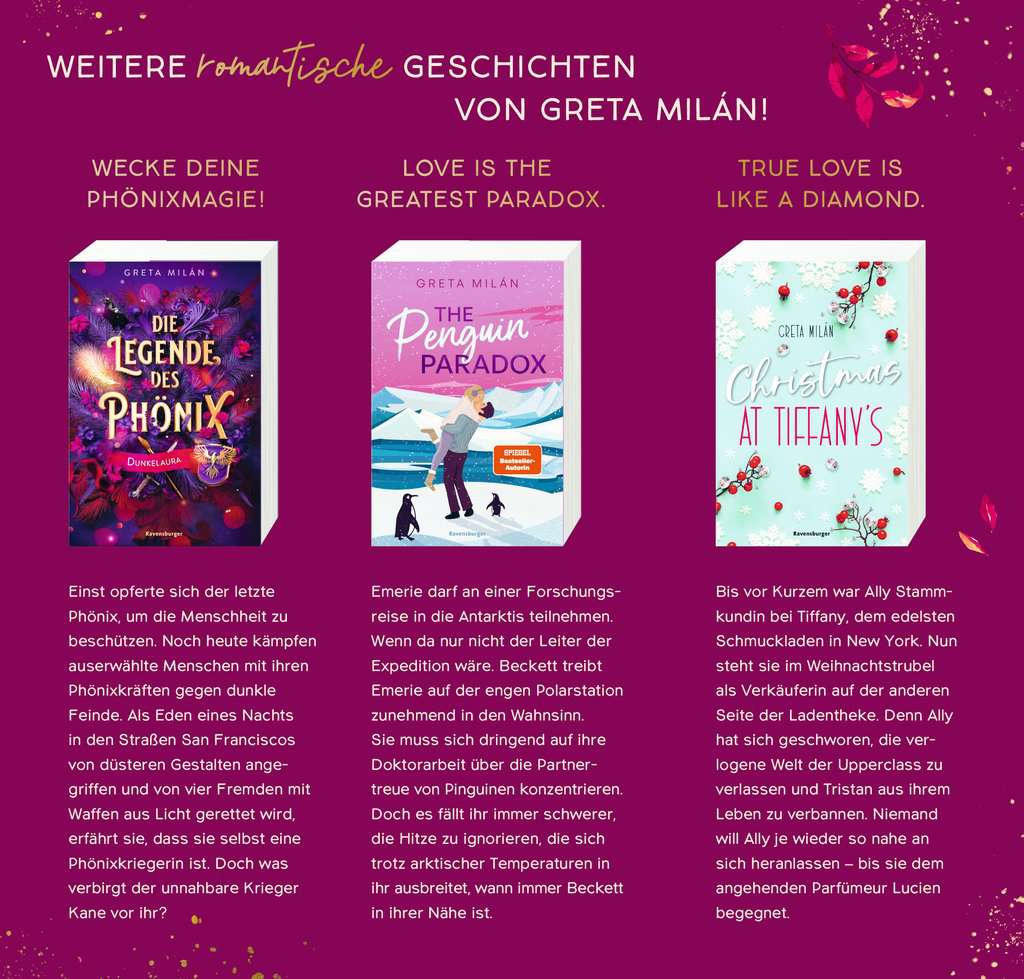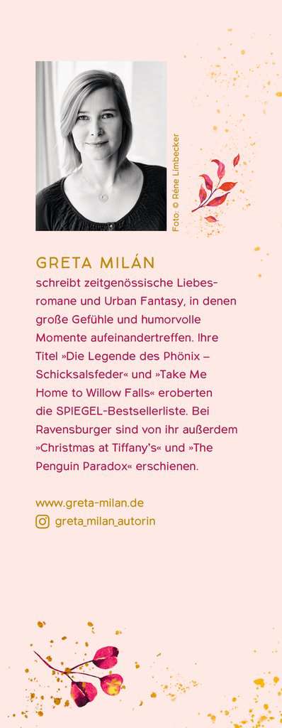 Greta Milán published her first book in 2013 and has been writing emotional romance novels, new-adult love stories and fantastic books for young people ever since. With "The Legend of the Phoenix", she made it onto the SPIEGEL bestseller list. Greta Milán has also published "The Oath of the Goddess", "Christmas at Tiffany's" and "Take Me Home to Willow Falls" with Ravensburger.