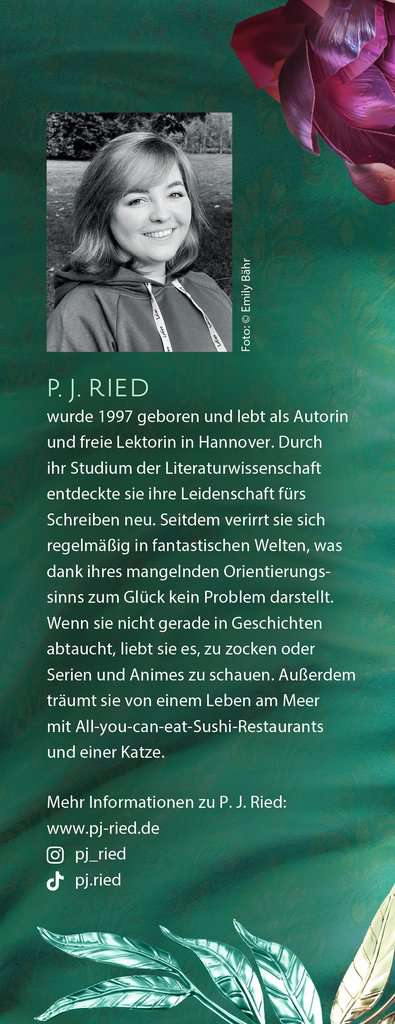 P. J. Ried rediscovered her passion for writing while studying literature. Since then, she regularly gets lost in fantastic worlds, which fortunately is not a problem despite her lack of sense of direction. When she's not immersing herself in stories, she loves to play games or watch series and anime. She also dreams of a life by the sea with lots of sushi and a cat.