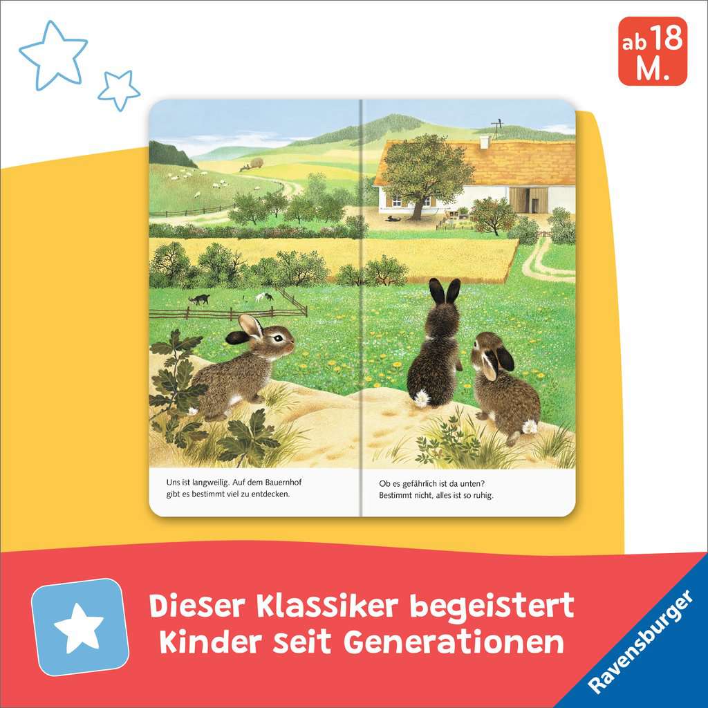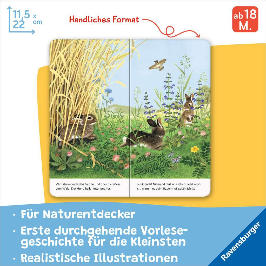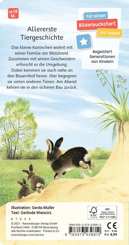 The little rabbit and its siblings live in a hollow tree trunk on the edge of the forest. Today, the little rabbit explores its surroundings, even venturing closer to the farm and encountering other animals. In the evening, after many exciting adventures, it returns to its mum and the safety of their burrow. A charming read-aloud story with catchy text for little nature explorers.
