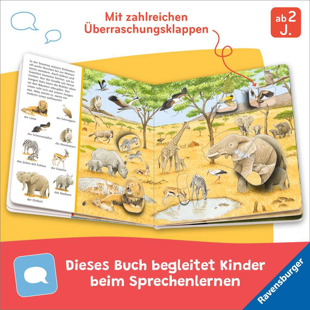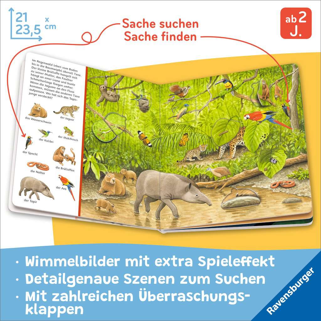 This journey through the animal world begins with domestic animals in the meadow, on the farm and in the forest. It continues into the jungle, the savannah and to Canada and even features animals under the sea and at the North and South Poles. Numerous flaps provide an extended view of the animal world and show how and where baby animals live. In addition, the famous "search and find" play principle invites children to look closely at the images and discover new things.