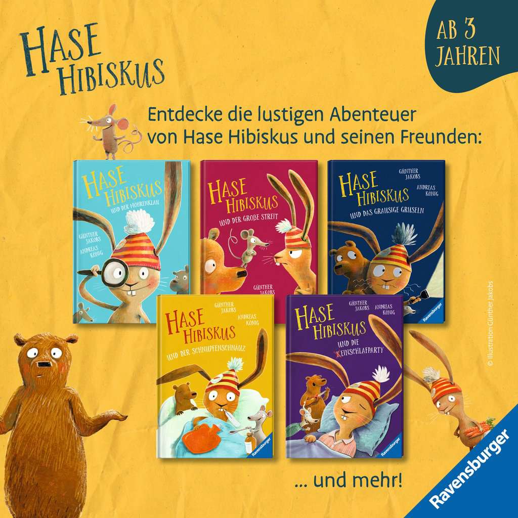 Rabbit Hibiscus, Maxi Mouse and Tom Bear are best friends. Their picture book adventures take us along into their colorful everyday lives and show young readers ages 3 and over that nothing can drive true friends apart. The stories are characterised by a large dose of humour, making reading them aloud truly enjoyable for both young listeners and adult readers. Günther Jakobs brings these funny stories by Andreas König to life in loving detail, with lots of color and a great sense of humour. Previously published by Ravensburger Verlag: “Rabbit Hibiscus and the Carrot Thief”, “Rabbit Hibiscus and the Best Friends in the World” and “Rabbit Hibiscus and the Big Fight”.